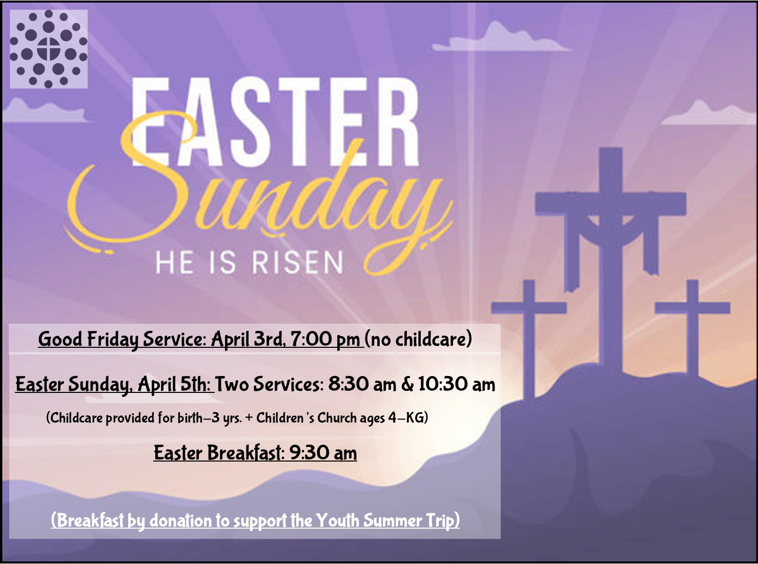 Please join us for Easter! We will be serving our annual Sunday morning Easter breakfast (9:30 am) with all donations benefiting the Sunrise Youth Summer Trip, 2026. Two services are available at 8:30 am and 10:30 am with childcare, birth -kindergarten, provided. Communion and Good Friday Service is also available Friday, April 3rd at 7:00 pm (no childcare). Invite friends or stop in! We would love to share this opportunity of worship with you!